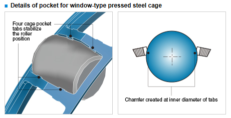 The window-type pressed steel cage provides higher rigidity. Each roller pocket is provided with four tabs.
